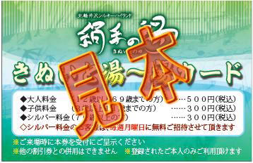 お一人様ごとに一枚「きぬいと湯〜湯かーど」を発行させて頂きます。